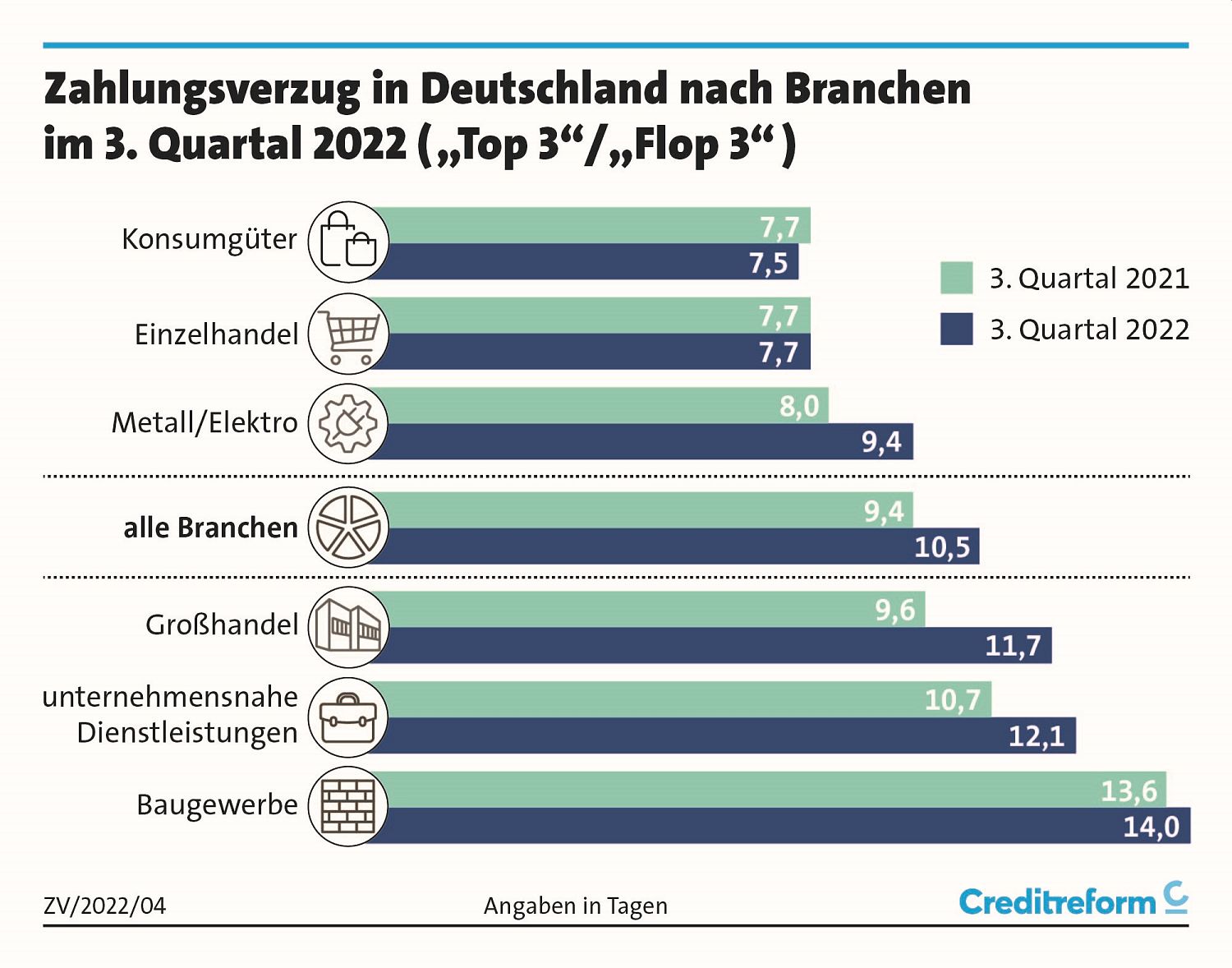 Auch bei den Wirtschaftssektoren gibt es teils große Unterschiede: Im Baugewerbe zahlen die Unternehmen mit Abstand am schlechtesten. Deren Zahlungsverzug hat sich um 0,4 Tage verschlechtert (3. Quartal 2022: 14,0 Tage; 3. Quartal 2021: 13,6 Tage). Bei den Konsumgütern (7,5 Tage), im einst arg gebeutelten Einzelhandel (7,7 Tage) und im Bereich „Metall/Elektro“ mit 9,4 Tagen wurden Rechnungen mit deutlich weniger Zahlungsverzug beglichen. Letztere Branche hat sich dennoch um ganze 1,4 Tage verschlechtert.
