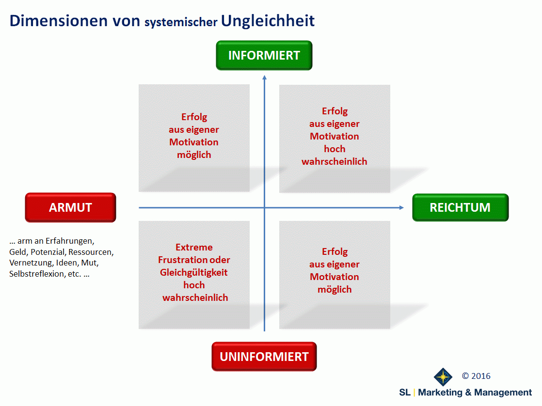 Dimensionen systemischer Ungleichheit. Vielfach wird in Soziologie oder Politik und anderen Gruppen von immer größer werdender Ungleichheit gesprochen oder geschrieben. Die Schere zwischen Arm und Reich wird immer größer und die Erkenntnis macht die Runde, dass das gar nicht das schlimmste Problem ist, sondern die viel größere Schere zwischen einem informierten Menschen und einem nicht informierten Menschen in der Gesellschaft existiert. Im Zeitalter von Massenmedien, dem immer noch recht frei zugänglichen Informationen via Internet oder auch der „Massenkommunikation“ sollte Informationsmangel eigentlich kein Thema sein. Doch genau das Gegenteil ist der Fall. Die Fülle und der Konsum massenweiser überflüssiger Informationen bringt leider kein Wissen hervor. Geschweige Können, das Wissen in Tat umsetzten könnte.