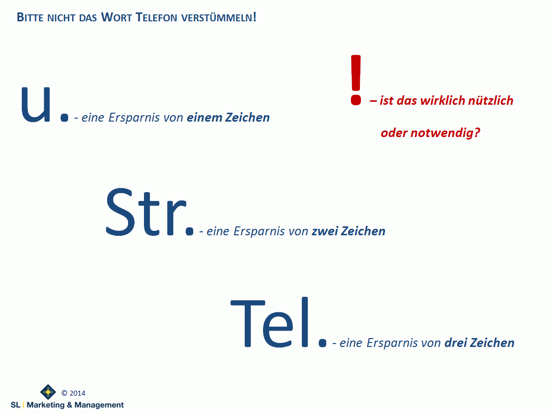 Es kostet nichts mehr, wenn man zwei Zeichen mehr Zeit hat, diese hin zuschreiben und so kein verstümmeltes Telefon oder Telefax dabei herauskommt. Im Gegenteil es schaut eleganter und flüssiger aus! „Und“ oder „Straße“ im Unternehmensdesign abzukürzen hat keinen Sinn!