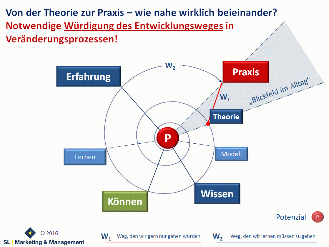 Praxisbezug und Veränderung, aber bitte nicht zu viel Theorie. Im Alltag von Unternehmern und Mitarbeitern wünschen wir uns eigentlich keine große Störungen. Leider sind da oft noch die Kunden, die Lieferanten oder schlaue Unternehmensberater sowie Coches, denen regelmäßig der Vorwurf gemacht wird, dass die guten Theorien eine Seite der Medaille sind, während der Praxisbezug die weit wichtigere Seite zu sein scheint. Doch STOP! Der Weg, der sich vermeintlich kürzer anfühlt, den wir viel lieber gehen würden, weil er schnellen Erfolg vorgaukelt, diesen Weg allein können wir in Veränderungsprozessen nicht gehen.