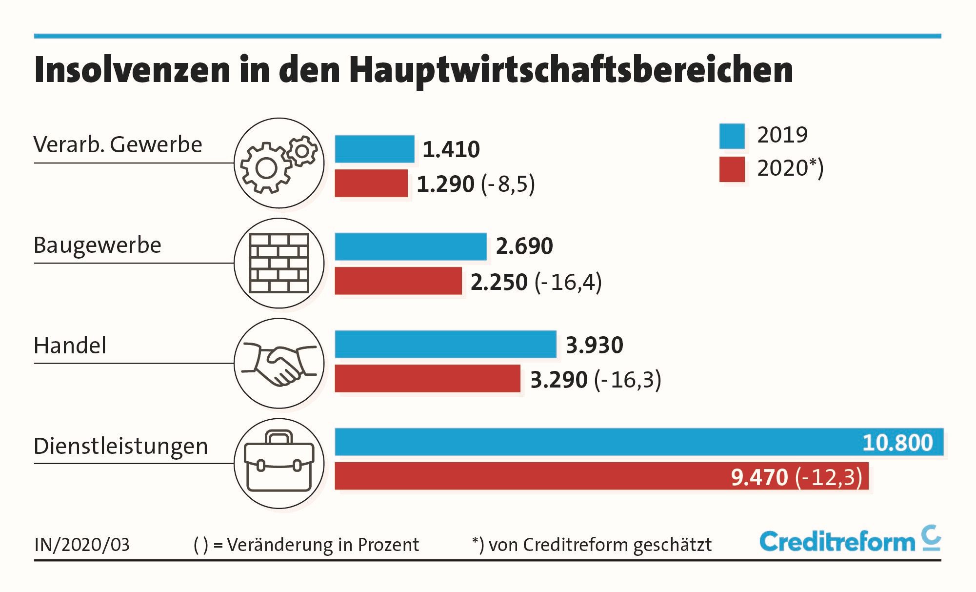 Insolvenzen in den Hauptwirtschaftsbereichen, nach Creditreform