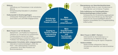 „Vor allem weiche Faktoren wie die kulturellen Rahmenbedingungen beeinflussen die Gründungstätigkeit von Männern und Frauen unterschiedlich. Die höheren Hürden für Frauen können nur in einem gesellschaftlichen Veränderungsprozess abgebaut werden, der sich in viele Bereichen wie zum Beispiel Erziehung, Bildung und häusliche Arbeitsteilung abspielen muss und daher einen langen Atem braucht“, sagt Dr. Fritzi Köhler-Geib, Chefvolkswirtin der KfW. „Aus volkswirtschaftlicher Sicht ist es sinnvoll, breiter anzusetzen als nur die Gründungstätigkeit von Frauen zu fördern. Da Frauen häufiger im Nebenerwerb, als Soloselbständige und seltener technologie- und wachstumsorientiert gründen, ist auch die wirtschaftliche Bedeutung frauengeführter Unternehmen in der Gesamtwirtschaft geringer. Auch was die Art der Gründungen betrifft müssen wir also für mehr Vielfalt sorgen. Vier Aktionsbereiche erscheinen dabei vorrangig: Erstens, den Gründungswunsch von Frauen zu erhöhen. Hier muss bereits in der Erziehung und Bildung ein Kulturwandel stattfinden. Zweitens, Gründerinnen ermutigen häufiger mit Wachstumsambitionen zu gründen. Drittens, die Technologie- und Innovationsorientierung von Gründerinnen zu erhöhen. Auch hier müssen wir bereits bei den Bildungsverläufen ansetzen und junge Frauen stärker für MINT-Fächer begeistern. Aber auch erfolgreiche Unternehmerinnen als Vorbilder müssen noch stärker sichtbar gemacht werden. Und schließlich muss viertens der VC-Zugang von Gründerinnen verbessert werden.“