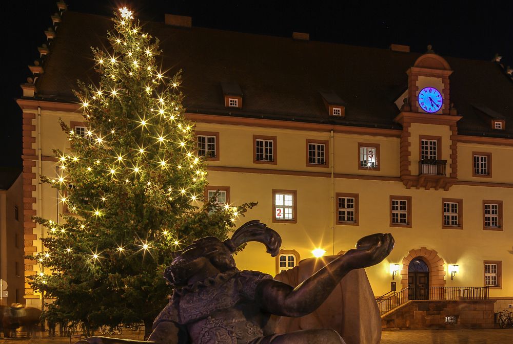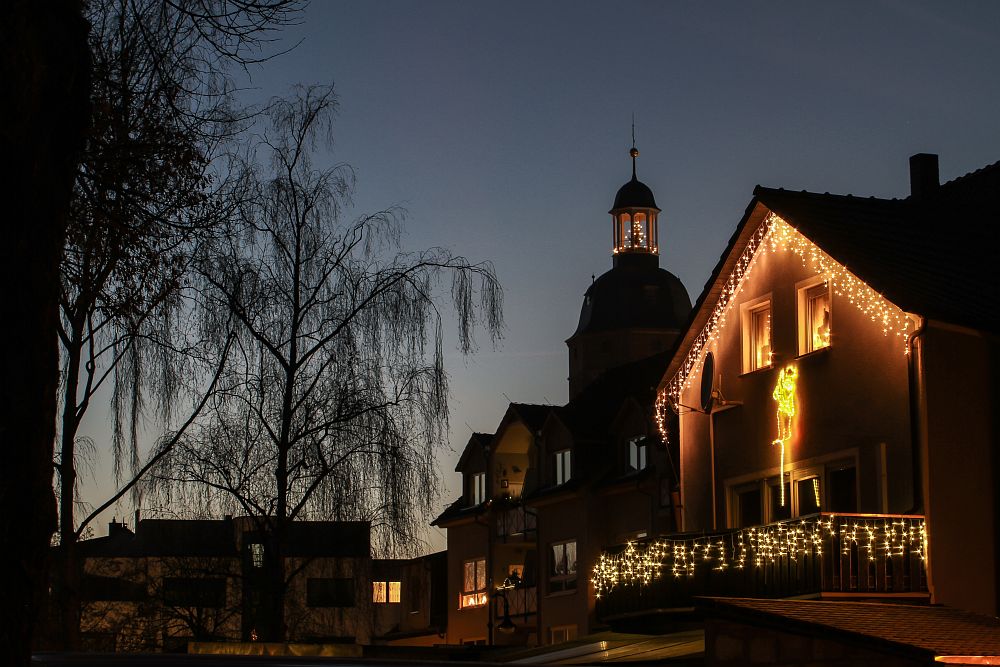 Eilenburg – Nikolaikirche mit Weihnachtsbaum und Hausfassade mit Beleuchtung