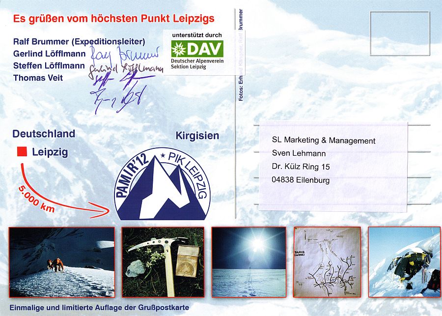 Ein ganz praktischer Nutzen sollte eine Postkarte vom höchsten Gipfel Leipzigs sein, wann bekommt man schließlich schon mal eine Karte aus so großer Höhe? Leider scheiterte es nicht an den Höhen sondern den Niederungen des Alltags. Nach jetzigen Erkenntnissen haben lediglich fünf von Kirgisien per Post versendete Karten Deutschland erreicht. Das ist bedauerlich, lässt sich aber nicht ändern. Wir als Unternehmen hatten auch eine solche Postkarte gekauft, nun wir haben wenigstens ein aus Deutschland versendetes Exemplar bekommen.