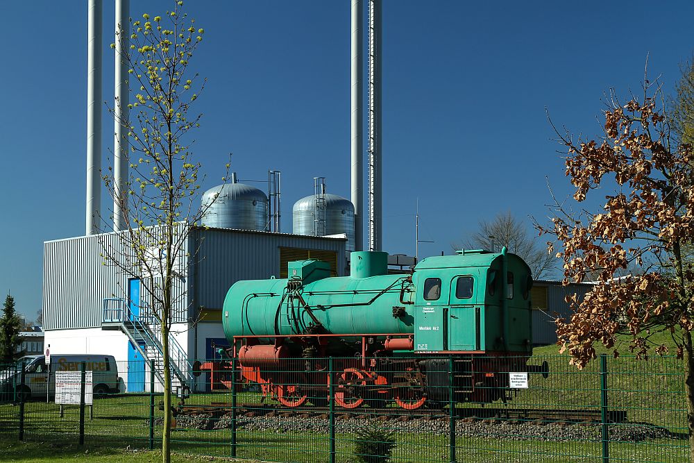 Hier zu sehen ist übrigens ein technisches Denkmal der Eisenbahngeschichte, eine recht seltene Dampfspeicherlokomotive, die zur Werkbahn des ehemaligen Eilenburger Chemiewerks gehörte (ECW).