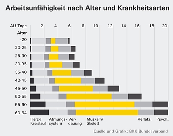 Muskel- und Skeletterkrankungen gehen im Wesentlichen auf Rückenleiden zurück. Gerade in diesem Bereich kann gezielte Prophylaxe der Chronifizierung von Rückenleiden, die in den älteren Jahrgängen zu einem starken Anstieg der Krankentage führen, vorbeugen. Auch bei den Herz-Kreislauferkrankungen sind Bewegung, Gewichtsreduktion und Raucherentwöhnung wichtige vorbeugende und therapiebegleitende Maßnahmen. Deutsches Netzwerk für betriebliche Gesundheitsförderung