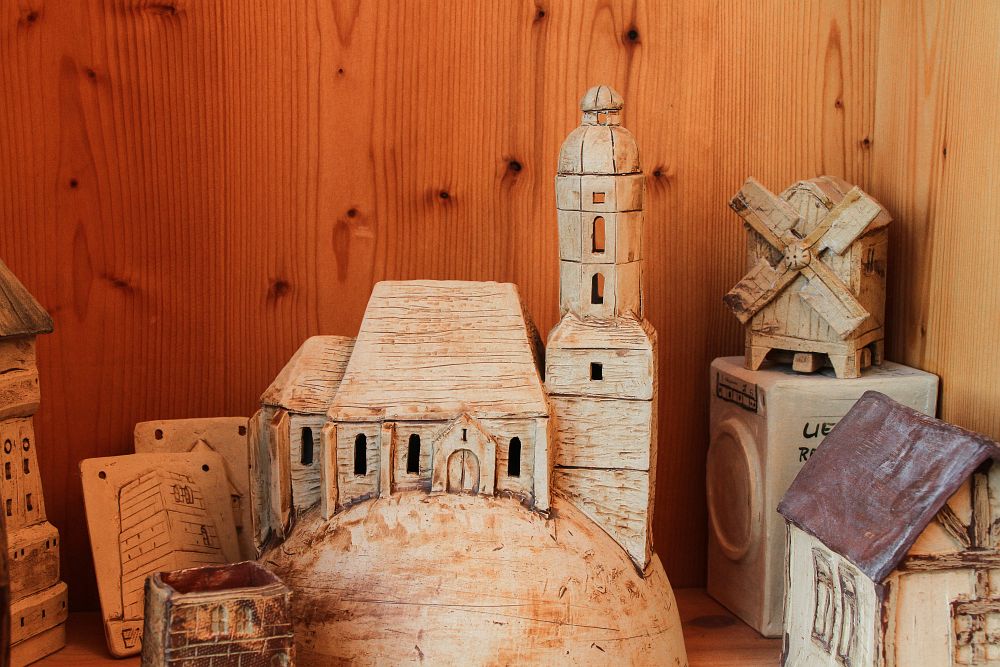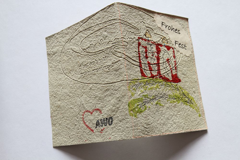 Wenn man an diesem Tag der offenen Tür durch die Zweigwerkstatt Eilenburg der AWO Werkstätten Sachsen-West geht, bemerkt der Besucher schnell, dieses Unternehmen gehört zu den Letztgenannten. Immer wieder stößt man auf den regionalen Bezug. Einige Bilder weiter unten zum Beispiel bin ich in der Ausstellung der Töpferei auf die „Abteilung Eilenburg“ gestoßen, in der die Ausstellungsstücke recht deutlich nach Sorbenturm, Nikolaikirche oder dem Wasserturm der Stadt ausschauen. Und auch in der Weihnachtskarte aus handgeschöpfem Papier finden sich eindeutig Elemente des Standortes der Werkstatt wieder.