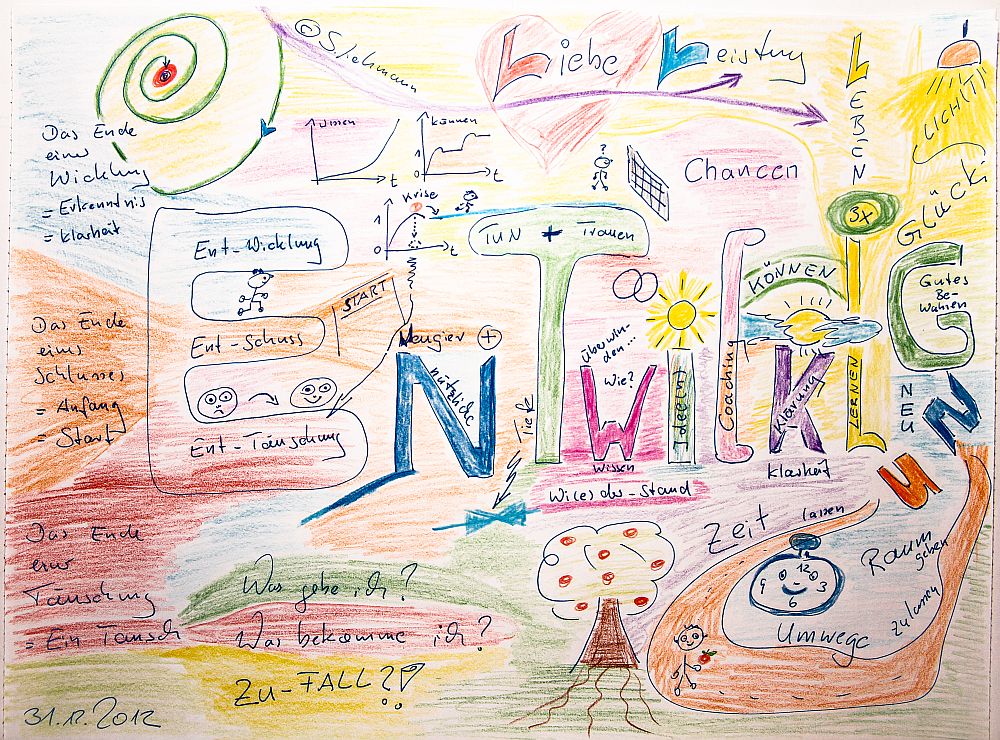 „E“ steht für … Zuerst ist es sinnvoll ein Blick auf das Wort Ent-Wicklung zu werfen. Wenn Entdeckung das Ende einer Verdeckung ist, dann ist Entwicklung das Ende einer (Ver-)Wicklung. Damit ist gemeint, dass jetzt eine neue Erkenntnis, Klarheit oder eine andere Etappe erreicht ist. Der Entwicklung wohnt auch immer ein Anfang inne. So kann Entwicklung auch für den Entschluss stehen. Den Entschluss jetzt etwas Neues zu beginnen, los zulaufen oder los zu denken. Und, das sei an dieser Stelle auch erwähnt, ist Entwicklung auch Enttäuschung. Enttäuschung ist ja aber auch positiv, eben das Ende einer Täuschung.