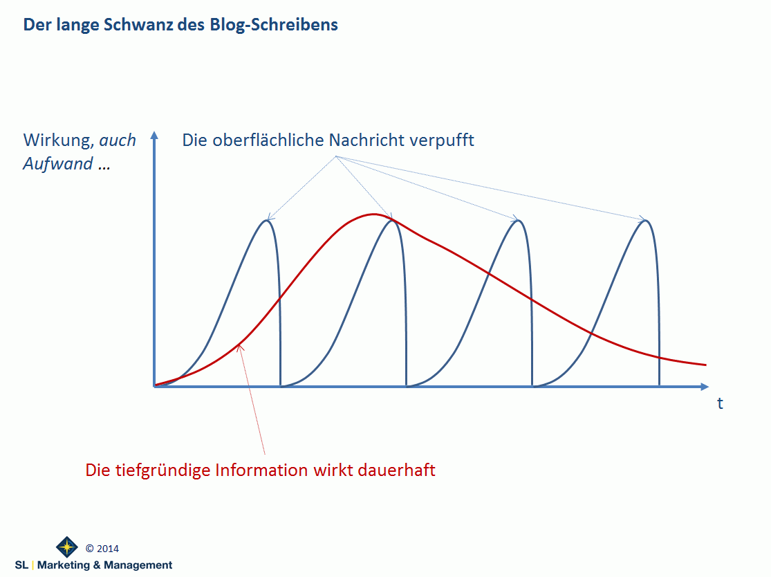 Es gibt eine ganze Reihe von Langzeit-Effekten, die eher eine Tiefen- als eine Breitenwirkung haben. Wenn ich täglich in unzähligen Netzwerken was Schlaues beitragen muss, kann ich nur schnell verbrauchte Oberflächeninformation bieten. Diese verpufft mit der Konsumtion meinst wirkungslos. Wie oft muss ein Mensch einen Button „toll“ oder „ganz toll“ oder den „Wie-auch-immer-eine-Wertung-stattfindet-Button“ drücken, um einen Auftrag, einen Kauf auszulösen oder überhaupt zu einem qualifizierten Kunden zu werden? Wenn der andere neben mir lauter schreit, dann habe ich mit solcher Art von Angebot keine Chance mehr und mein Geplapper wird immer sinnloser, weil immer nutzloser. Ganz im Gegensatz zu Schreiben in einem Blog, in dem man sich schon genau überlegen muss, was ist nützlich und was ist dauerhaft hilfreich für mich und meine Kunden.