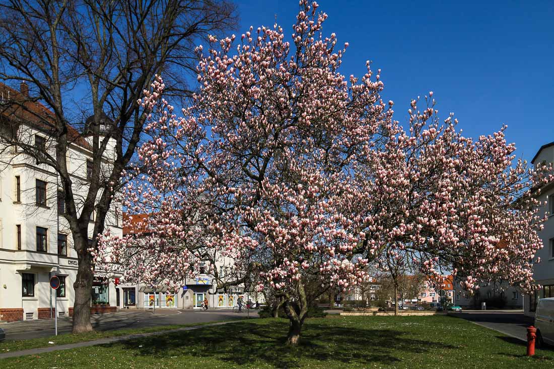 Eilenburg, April 2015 – Es ist Frühling in der Stadt, das ist an überall offensichtlich. Nicht jedes Jahr hat man das Glück, dass die große alte Magnolie vorm Bürofenster im Eilenburger Dr.-Külz-Ring in voller Pracht blüht. Dieses Jahr scheint es wieder so weit zu sein, unzählige Blüten stahlen bald vor Frühjahresfreude. Wenn man unterwegs ist in diesen Frühjahrestagen, dann fallen einen diese herrlichen Bäume sofort auf. Egal ob in Leipzig oder kleineren Orten, ein solch prächtiges Exemplar ist selten. Grund genug, sich der Blüte dieses Baumes auch in diesem Jahr fotografisch zu widmen.