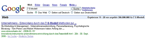 Gerade aufgefallen: Streuverluste ist mit der Suchbegriff-Kombination „7 S Modell“ auf Position 11 von mindestens 306.000.000 Suchergebnissen bei Google, das finde ich erwähnenswert.